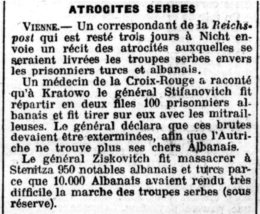 “Vjenë – Një korrespondent i Reichspost, i cili ka qëndruar tri ditë në Nish, dërgon një rrëfim të mizorive të kryera nga ushtarët serbë ndaj të burgosurve turq dhe shqiptarë.