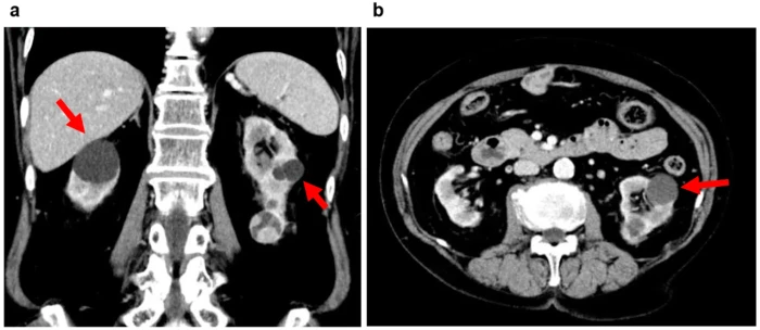 Diagnostikimi është i thjeshtë dhe shpesh i rastësishëm, pasi cistet zbulohen gjatë ekzaminimeve të kryera për arsye të tjera. Ekografia është zgjedhja e parë, sepse tregon qartë nëse cisti është e mbushur me lëng, ndërsa CT-ja dhe rezonanca magnetike ndihmojnë më tej në dallimin e cisteve nga masat solide.