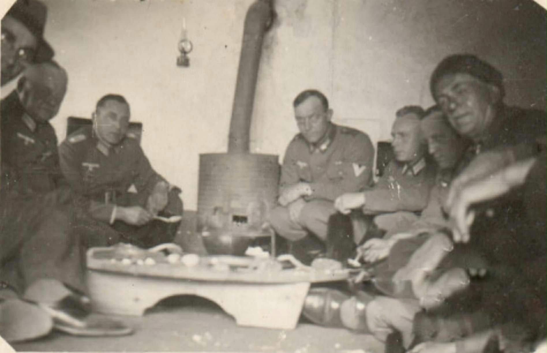 Në këtë fotografi, oda shndërrohet në një hapësirë ku takohen kultura të ndryshme dhe interesa politike të kohës së luftës. Ushtarët gjermanë të ulur pranë sofrës tregojnë jo vetëm praninë ushtarake, por edhe marrëdhëniet e ndërlikuara që u krijuan në rrethana okupimi.