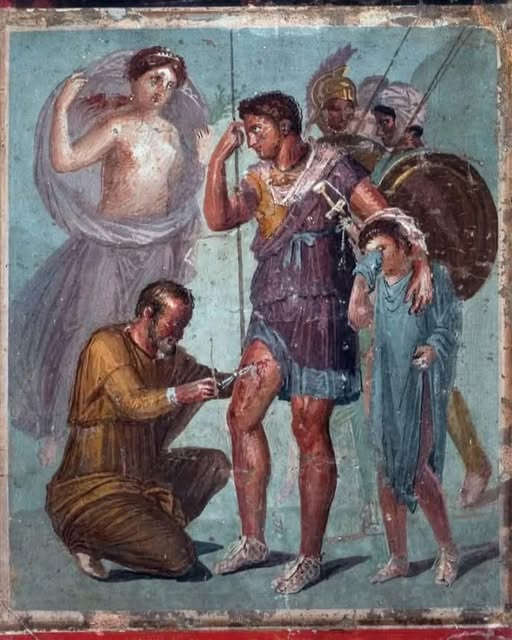 Ndërhyrjet mjekësore përgjatë antikitetit: Skena tregon mjekun/shëruesin Japix duke hequr me kujdes majën e shigjetës nga këmba e heroit dardan të Trojës, Enea!