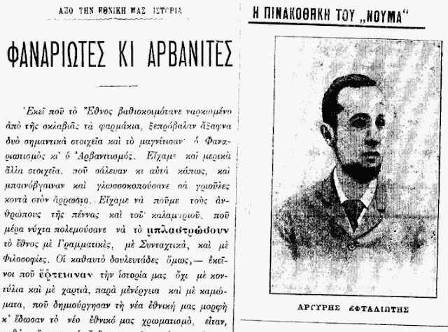 Në dokumentin e titulluar “Historia e Madhe e Epirit dhe e Shqipërisë” (1908), autori thekson një të vërtetë që shpesh censurohet: Shqiptari-Arvanit ishte protagonisti kryesor dhe arkitekti i vitit 1821 (Viti i revolucionit “grek”). Ata nuk luftuan si mercenarë për një komb të huaj, por për një “Patridë të përbashkët” (Vatër të përbashkët). Por, siç vërehet në dëshmitë e mëvonshme, pas fitores, “arkitektët” u dëbuan nga ndërtesa që projektuan vetë. Flamuri që ata ngritën në malet e Epirit dhe të Moresë u mor nga elita e instaluar, e cila filloi procesin e “pastrimit” të termave, duke i shndërruar heronjtë arvanitas në “Hellenë të pastër”.